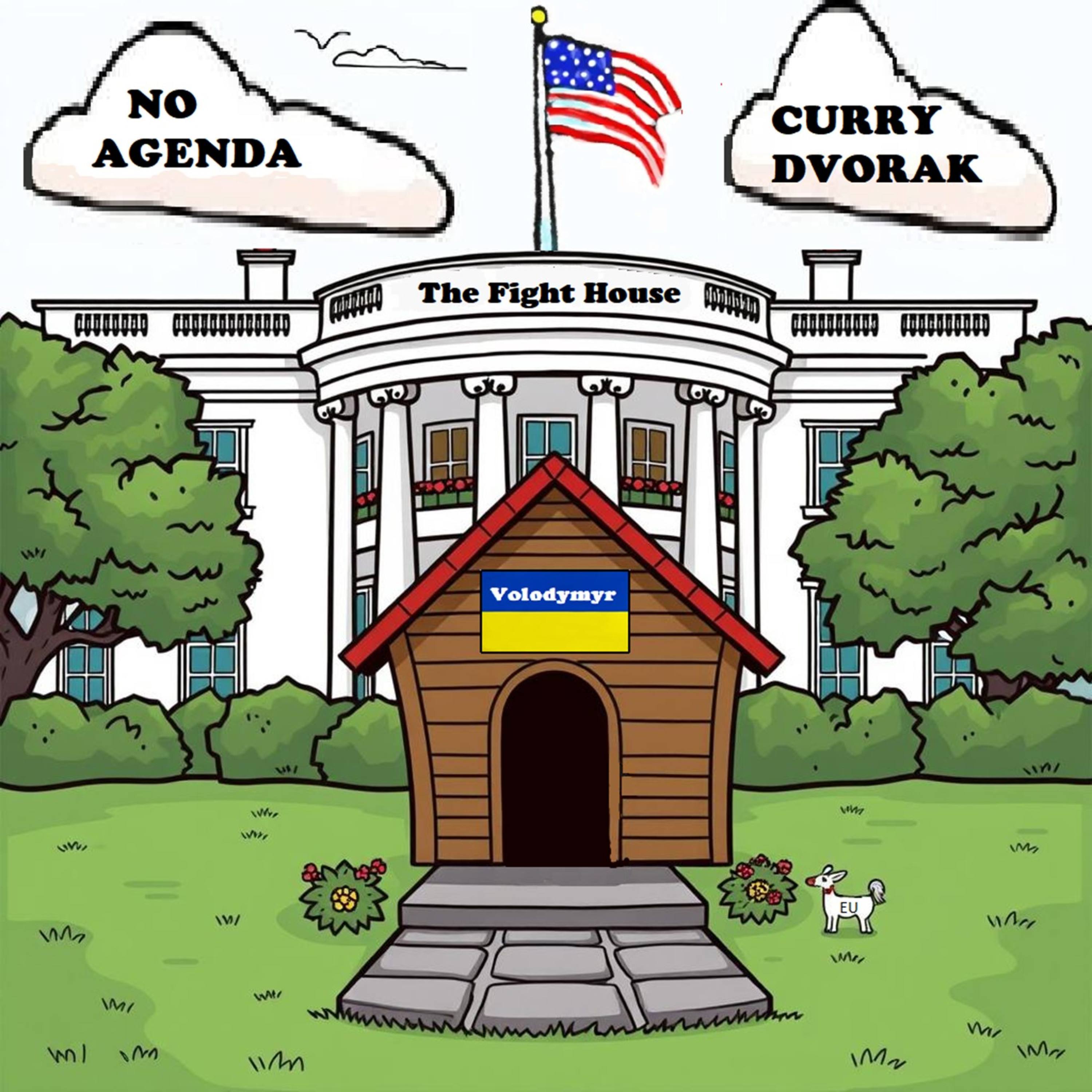 Comic image of the White House with a dog house in the front garden with the name 'Volodymyr' on it.