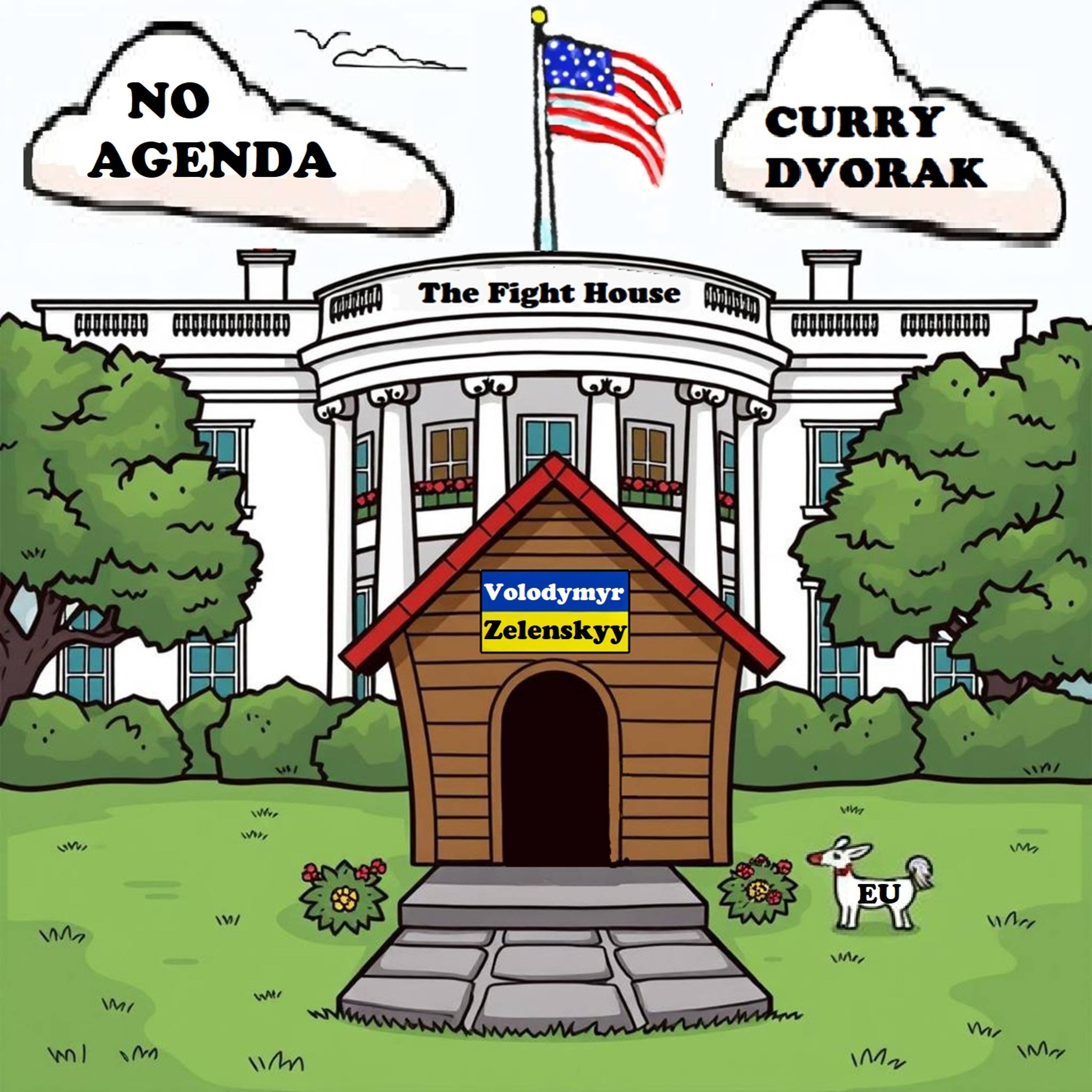 Comic image of the White House with a dog house on the front garden with a sign on it with the name 'Volodymyr Zelenskyy', who is in the dog house with the Trump Administration. Note the wee dog with EU on it showing that the EU does not have the influence the States and President Trump does.