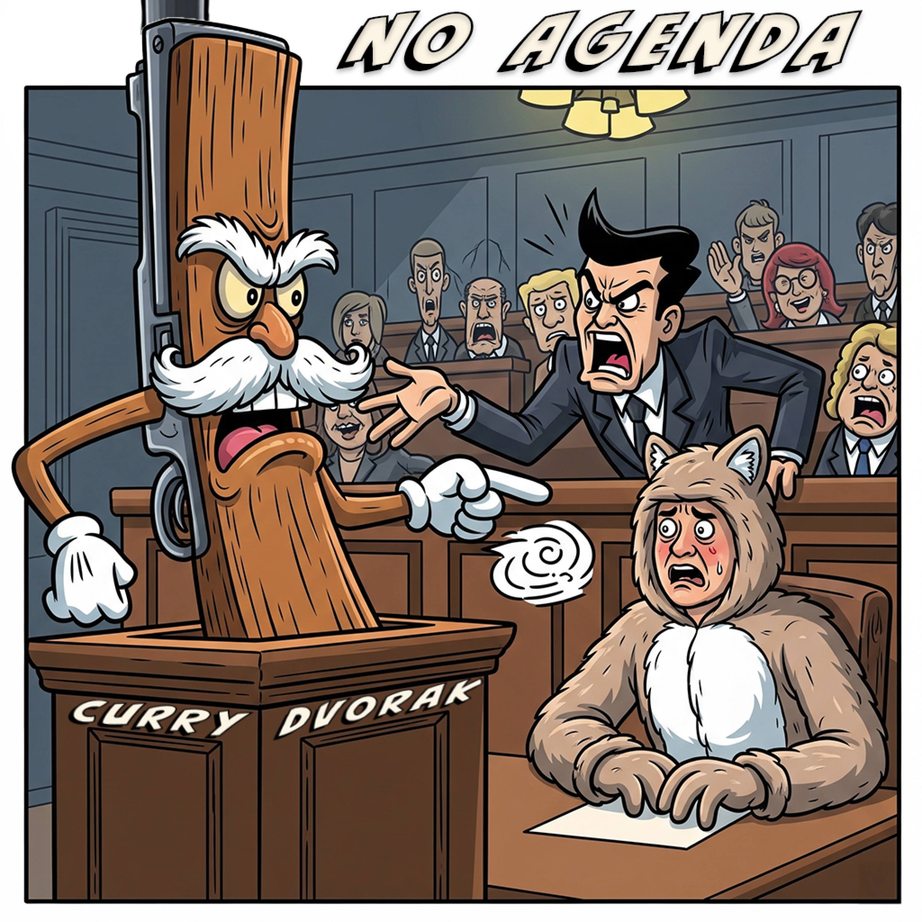 The cartoon shows a rifle in the witness stand, pointing at the defendant as if yelling, "He did it!" In response, the defendant—a furry in a full animal costume—has a priceless look of guilt on his face.