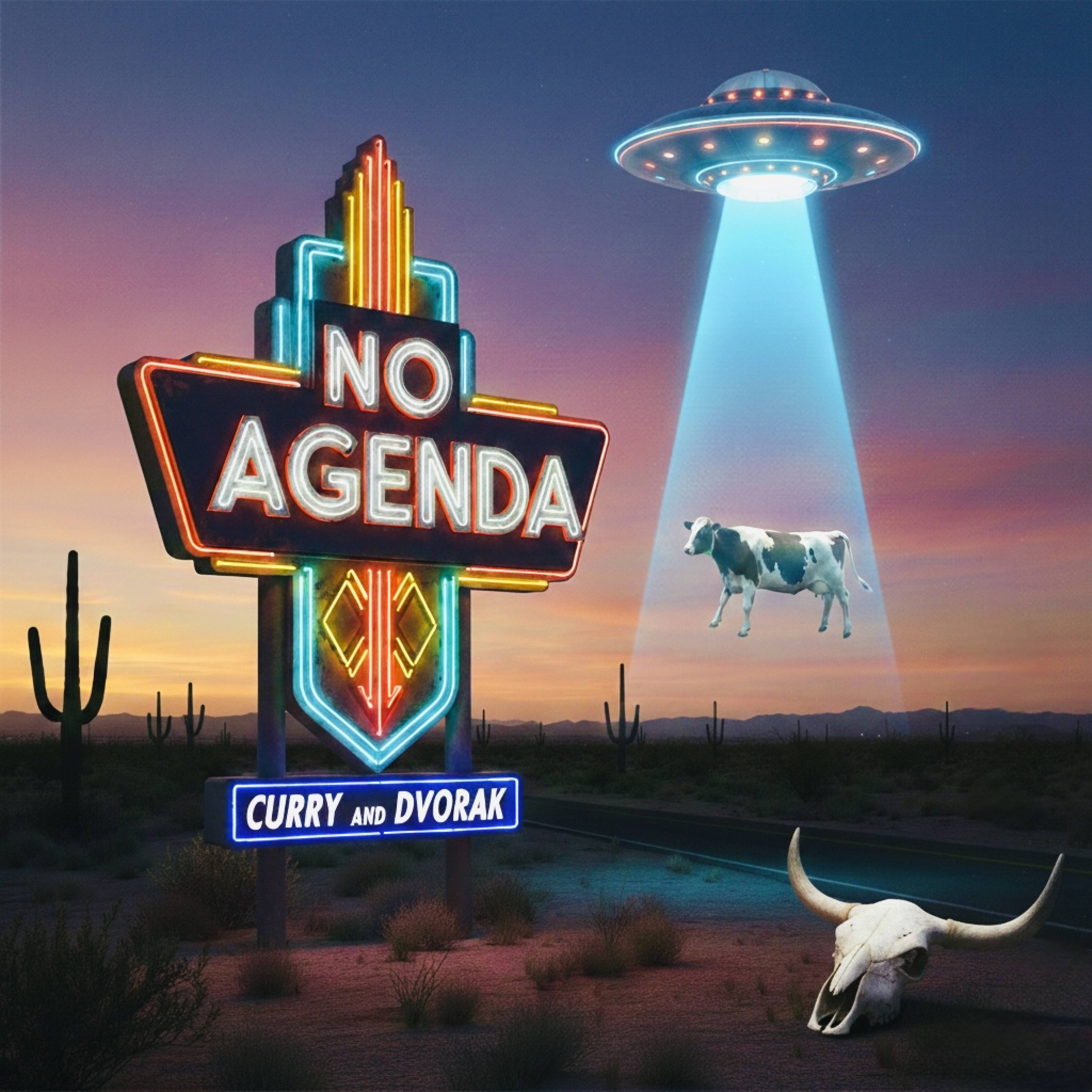 No agenda neon sign with cow being abducted in the desert